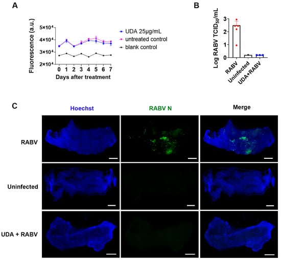 To investigate whether UDA can prevent the RABV infection of muscle tissue, the muscle strips were pre-incubated with UDA (25 μg/mL) for 2 h, followed by virus inoculation in the presence or absence of UDA. After 4 h, the virus inoculum was removed, and new medium, with or without UDA (25 μg/mL), was added. On day 6 post-infection, the culture supernatant was collected for titration on BHK cells, and the muscle tissues were fixed for immunofluorescence staining. The UDA treatment resulted in a significant decrease in virus production in the medium (Figure 5B) and in antigen expression in the cells (Figure 5C). At a concentration of 25 µg/mL, UDA had no adverse effect on the viability of the muscle strips during the 7-day exposure period (Figure 5A).