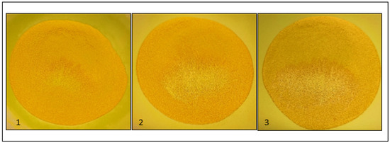 Visualization of the three different formulations after tapping 10 times. The homogeneity is determined based on the number of white particles at the powder surface. 1: formulation 1, 2: formulation 2 and 3: formulation 3 as shown in Table 2.