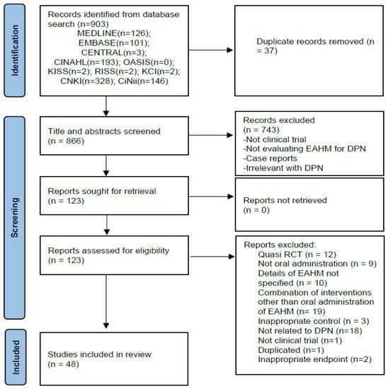 Based on the search strategy, 903 potentially relevant articles were identified through electronic searches of 10 databases. After excluding 37 duplicates, 866 articles were retrieved. After screening titles and abstracts, 743 articles that met at least one of the exclusion criteria were excluded. The full texts of the remaining 123 studies were assessed, and 75 articles were excluded for the reasons listed in Figure 1. Finally, 48 eligible studies were included in our meta-analysis [,,,,,,,,,,,,,,,,,,,,,,,,,,,,,,,,,,,,,,,,,,,,,,,]. The screening process is summarized in the PRISMA 2020 flow diagram (Figure 1).