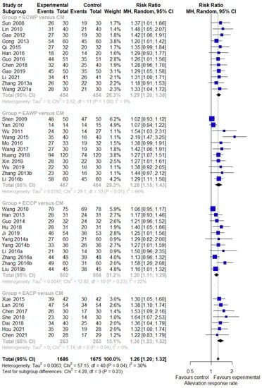 A pairwise meta-analysis was conducted for each intervention (EACP, ECCP, EAWP, and ECWP) to evaluate the effects on the response rate, motor nerve conduction velocity (MNCV), and sensory nerve conduction velocity (SNCV) compared to the control group.
