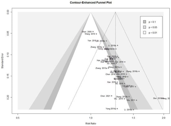 A pairwise meta-analysis (PMA) was performed to directly compare the EAHM with the comparator. Evidence synthesis of the included studies using the available data was performed by calculating the effect size and 95% confidence interval (CI) using a random-effects model. Heterogeneity was considered statistically significant when the p-value based on the χ2 test was <0.10 or I² was ≥50%. Two-sided p < 0.05 was considered statistically significant. Statistical synthesis of individual research results was performed using the software R (version 4.1.2; R Foundation for Statistical Computing, Vienna, Austria) and RStudio version 2022.02.3 build 492 (Integrated Development for R. RStudio, PBC, Boston, MA, USA) using the default settings of the ”meta” and ”metafor” package []. The RR and 95% confidence interval (CI) were calculated for the response rate. The mean difference (MD) and 95% confidence interval (CI) were calculated for the motor and sensory nerve conduction velocities. If heterogeneity was observed in the synthesized meta-analysis results for outcome measures involving > 10 trials, the cause of heterogeneity was traced using sensitivity analysis. To distinguish publication bias, a contour-enhanced funnel plot that included most of the studies was used []. To address the asymmetry of the visually confirmed funnel plot, Egger’s test [] and Begg’s test [] were performed to confirm publication bias. The overall quality of evidence for each outcome was evaluated using the Grading of Recommendations Assessment, Development, and Evaluation (GRADE) Pro []. The GRADE assessment evaluated the overall quality of evidence on four levels: very low, low, moderate, and high. The level of evidence is lowered by factors such as the risk of bias, inconsistency, indirectness, imprecision, and publication bias.