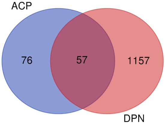 All bioactive ingredients in the ACP were screened and retrieved from the Traditional Chinese Medicine Systems Pharmacology (TCMSP; https://tcmsp-e.com/) analysis platform []. In this study, components with oral bioavailability (OB) ≥ 30% and drug-likeness (DL) index ≥ 0.18 were selected as candidate ingredients. The target information of active ingredients was standardized using the Uniprot database (http://www.uniprot.org/) with the species filter “Homo sapiens”. Using “diabetic peripheral neuropathy” as the keyword, data on DPN-related target genes were obtained from the GeneCards database (http://www.genecards.org). For targets in GeneCards, only those with a score ≥ 10 were screened []. Venn diagrams of consensus targets between the ACP and DPN were constructed using the Bioinformatics and Evolutionary Genomics website (https://bioinformatics.psb.ugent.be/webtools/Venn/). Using Cytoscape (v. 3.9.1; https://cytoscape.org/), a network of the components of the ACP and DPN targets was created to graphically depict the complex interactions between compounds and targets. The degree of each node is measured using a layout tool: the larger the node in the network, the higher the degree. The STRING protein analysis platform (v. 11.5; https://string-db.org/), together with the protein categorization “Homo sapiens”, was used to import the interacting gene targets of the ACP and DPN []. Protein interaction network analysis was performed and Cytoscape software version 3.9.1 [] was used to construct protein–protein interaction (PPI) network maps. Gene targets with a degree of centrality above the average value were selected as hub targets. Gene ontology (GO) functional analysis was used as the primary method to describe the functions of gene targets, including biological processes, cellular components, and molecular functions. Kyoto Encyclopedia of Genes and Genomes (KEGG) enrichment analysis was used to identify common targets of the ACP and DPN in the signaling pathways. Metascape (https://metascape.org/), an online tool for gene enrichment analysis, incorporates more than 40 functional annotation datasets []. Hub targets were uploaded to the Metascape platform for GO and KEGG analyses. The data selection criterion was set at p < 0.05.