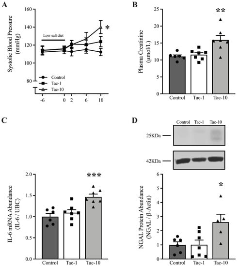 Tacrolimus (10 mg/Kg/d, Tac-10) promotes an increase in blood pressure and renal damage in WT mice after 10 days. Systolic blood pressure was determined by administering low-salt-diet treatment and Tac until day 10 (A). Plasma creatinine (B), IL-6 mRNA abundance (C), and NGAL protein abundance (D) at the renal level were determined after 10 days of Tac treatment with doses of 1 mg/Kg/d (Tac-1) and 10 mg/Kg/d (Tac-10). For qRT-PCR and Western blotting analyses, Ubiquitin-C (UBC) and β-Actin were employed as the housekeeping gene and loading control, respectively. A representative image of NGAL and β-Actin expression is shown in the insert D. The data are presented as mean ± SEM (n = 3–7). One-way ANOVA; * p < 0.05, ** p < 0.01, and *** p < 0.001 vs. Control.