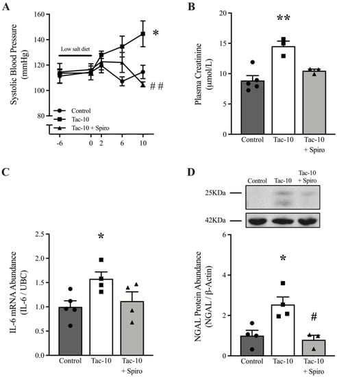 High blood pressure, renal dysfunction, and NGAL overexpression induced by Tac-10 in WT mice were prevented by spironolactone. Systolic blood pressure was determined by administering low-salt-diet treatment along with Tac-10 and 100 mg/Kg/d spironolactone (Spiro) (A). Plasma creatinine (B), IL-6 mRNA expression (C), and NGAL protein abundance (D) at the renal level were measured after administering Tac-10 and Spiro for 10 days. UBC and β-Actin were used as the housekeeping gene and loading control for qRT-PCR and Western blotting assays, respectively. A representative image of NGAL and β-Actin expression is shown in the insert D. The data are expressed as the mean ± SEM (n = 3–6). One-way ANOVA; * p < 0.05 and ** p < 0.01 vs. Control; # p < 0.05 and ## p < 0.01 vs. Tac-10.