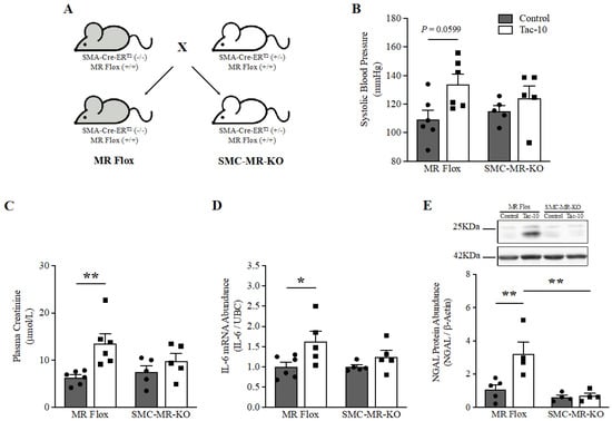 In a separate investigation, we demonstrated that the SMC-MR significantly contributes to CsA-induced nephrotoxicity and alterations in renal hemodynamics in mice [27]. Based on those findings, we examined whether the SMC-MR was also involved in the kidney injury induced by Tac. To determine this, we used the same strategy of SMC-specific deletion of MR (SMC-MR-KO) [30] to assess the kidney injury induced by Tac-10 in mice (Figure 3A).