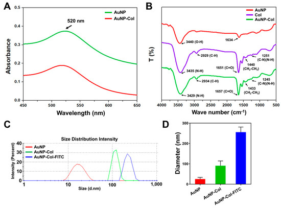 Identification of AuNP-derived nanomaterials. (A) The UV-Vis spectrum indicated the typical peak of AuNP at the wavenumber of 520 nm in AuNP-Col-FITC, which demonstrated the presence of AuNP. (B) The FTIR spectrum of pure AuNP, pure Col, and AuNP-Col nanomaterials. (C,D) The size distribution intensity and diameter of nanoparticles were measured by DLS assay. The result is displayed as mean ± SD (n = 3).