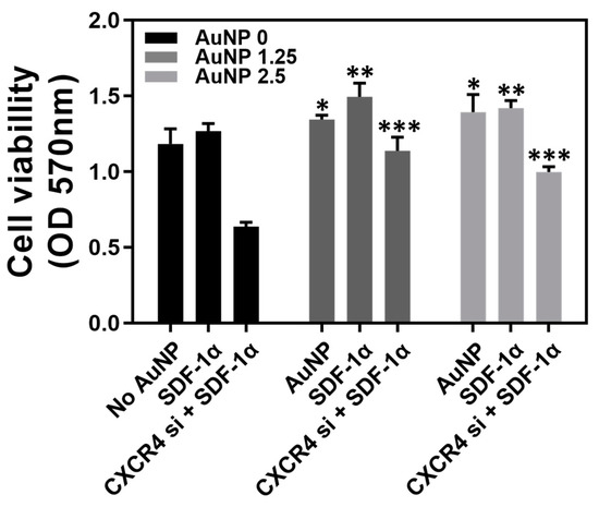 Cell viability of Wharton’s jelly MSCs with various treatments after 48 h incubation. The MSCs were treated with different treatments: AuNP 0 ppm group (No AuNP, SDF-1α, CXCR4 siRNA + SDF-1α), AuNP 1.25 ppm (pure AuNP, SDF-1α, CXCR4 siRNA + SDF-1α), and AuNP 2.5 ppm (pure AuNP, SDF-1α, CXCR4 siRNA + SDF-1α). The results were quantified and compared with the AuNP 0 ppm group in triplicate. * p < 0.05, ** p < 0.01, *** p < 0.001: compared to AuNP 0 ppm group.