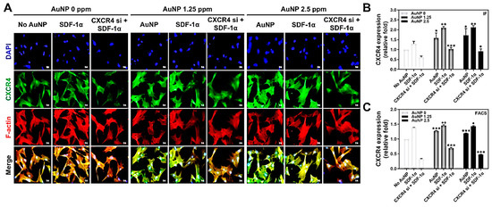 To explore the relationship between SDF-1α/CXCR4 and AuNP, we further investigated the expression of CXCR4 in Wharton’s jelly MSCs with the induction of AuNP. The MSCs were treated with AuNP 0 ppm, 1.25 ppm and 2.5 ppm solution for 48 h, and the CXCR4 green fluorescence intensity was captured and analyzed by IF and FACS methods. Figure 3A displays the CXCR4 expression in MSC enhanced by AuNP, and the FACS histograms are demonstrated in Figure S3. The results, quantified based on the CXCR4 fluorescence intensity, are shown in Figure 3B: AuNP 0 ppm treatment (No AuNP: ~1-fold, SDF-1α: ~1.29-fold, CXCR4 si + SDF-1α: ~0.60-fold), AuNP 1.25 ppm treatment (pure AuNP: ~1.59-fold, SDF-1α: ~2.10-fold, CXCR4 si + SDF-1α: ~1.03-fold), and AuNP 2.5 ppm treatment (pure AuNP: ~1.72-fold, SDF-1α: ~2.12-fold, CXCR4 si + SDF-1α: ~0.91-fold). Furthermore, the CXCR4 fluorescein-positive cells were detected with flow cytometry, and results are displayed in Figure 3C: AuNP 0 ppm treatment (No AuNP: ~1-fold, SDF-1α: ~1.38-fold, CXCR4 si + SDF-1α: ~0.32-fold), AuNP 1.25 ppm treatment (pure AuNP: ~1.27-fold, SDF-1α: ~1.45-fold, CXCR4 si + SDF-1α: ~0.69-fold), and AuNP 2.5 ppm treatment (pure AuNP: ~1.19-fold, SDF-1α: ~1.43-fold, CXCR4 si + SDF-1α: ~0.47-fold). According to the quantification, although the CXCR4 expression in the MSCs was knocked down, treatment with AuNP 1.25 and 2.5 ppm could significantly enhance its expression.