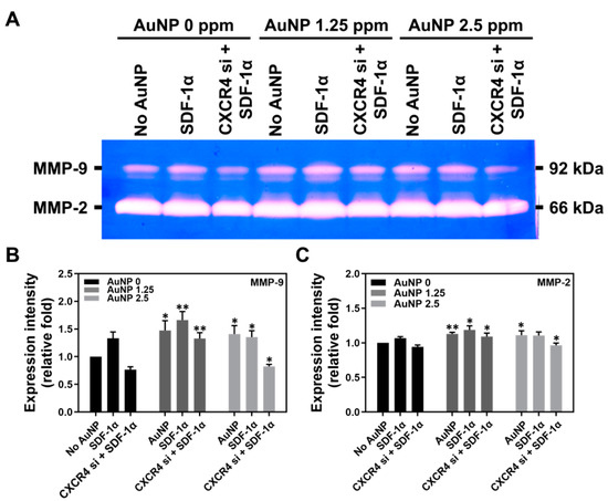 The MMPs expression, migration ability and apoptosis-related protein expression within Wharton’s jelly MSCs were investigated. The SDF-1α/CXCR4 pathway was associated with biological performances, such as cell migration. The zymogram of MMPs expression in MSCs after treatment with AuNP for 48 h is shown in Figure 4A, while the quantifications of MMP-9 and MMP-2 are shown in Figure 4B,C, respectively. The results of MMP-9 expression are as follows: AuNP 0 ppm treatment (No AuNP: ~1-fold, SDF-1α: ~1.33-fold, CXCR4 si + SDF-1α: ~0.76-fold), AuNP 1.25 ppm treatment (pure AuNP: ~1.47-fold, SDF-1α: ~1.66-fold, CXCR4 si + SDF-1α: ~1.32-fold) and AuNP 2.5 ppm treatment (pure AuNP: ~1.41-fold, SDF-1α: ~1.35-fold, CXCR4 si + SDF-1α: ~0.82-fold). The results of expression intensity of MMP-2 are as follows: AuNP 0 ppm treatment (No AuNP: ~1-fold, SDF-1α: ~1.06-fold, CXCR4 si + SDF-1α: ~0.94-fold), AuNP 1.25 ppm treatment (pure AuNP: ~1.12-fold, SDF-1α: ~1.18-fold, CXCR4 si + SDF-1α: ~1.09-fold) and AuNP 2.5 ppm treatment (pure AuNP: ~1.11-fold, SDF-1α: ~1.10-fold, CXCR4 si + SDF-1α: ~0.96-fold).
