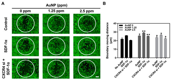 Wharton’s jelly MSCs migration ability with AuNP treatment for 48 h. The MSCs were assigned to three groups: No treatment, SDF-1α treatment, and CXCR4 si + SDF-1α treatment. In addition, AuNP 0 ppm, 1.25 ppm and 2.5 ppm were added to the above three groups to observe the induction of migration ability. (A) The movement of MSCs into the boundary area was observed by fluorescence intensity within each group. The scale bars are equal to 200 μm. (B) The distance of MSC movement in the boundary area was further quantified, and the results were compared with the AuNP 0 ppm group in triplicate. * p < 0.05, ** p < 0.01: compared to AuNP 0 ppm group.
