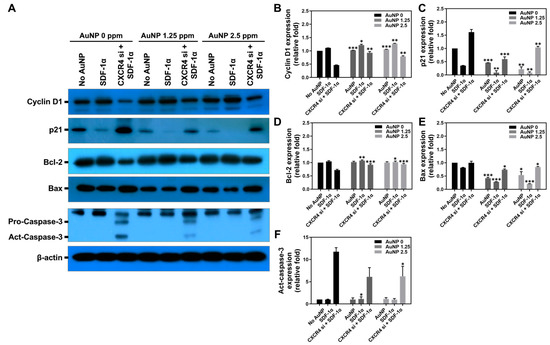 Expression of cell apoptotic-related proteins in Wharton’s jelly MSCs with various treatments for 48 h. The MSCs were assigned to three groups: No treatment, SDF-1α treatment and CXCR4 si + SDF-1α treatment. Next, the different concentrations of AuNP solution were added for investigation of cell apoptosis. (A) The immunoblots of apoptotic-related proteins expressed in MSC are depicted. The expression of each protein was quantified as: (B) Cyclin D1, (C) p21, (D) Bcl-2, (E) Bax and (F) Act-Caspase-3. The results were compared with the AuNP 0 ppm group in triplicate. * p < 0.05, ** p < 0.01, *** p < 0.001: compared to AuNP 0 ppm group.
