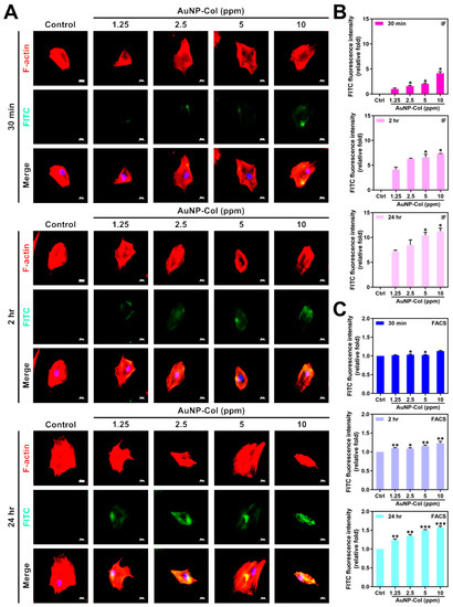 To investigate AuNP uptake efficiency in Wharton’s jelly MSCs, the various concentrations of AuNP (1.25, 2.5, 5, 10 ppm) were combined with Type I collagen (Col), which is denoted as AuNP-Col. Furthermore, the AuNP-Col were conjugated with FITC for treatments with MSC followed by investigations with fluorescence microscopy and flow cytometry. The green FITC fluorescence images and FACS diagrams of AuNP-Col are shown in Figure 7A and Figure S4, while the quantitative analysis based on IF and FACS methods are shown in Figure 7B,C. The results from the IF method are as follows: 30 min (Control (0.00-fold), AuNP 1.25 ppm (~1.00-fold), AuNP 2.5 ppm (~1.57-fold), AuNP 5 ppm (~2.04-fold) and AuNP 10 ppm (~4.15-fold)); 2 h (Control (0.00-fold), AuNP 1.25 ppm (~4.14-fold), AuNP 2.5 ppm (~6.29-fold), AuNP 5 ppm (~6.57-fold) and AuNP 10 ppm (~7.34-fold)); 24 h (Control (0.00-fold), AuNP 1.25 ppm (~7.22-fold), AuNP 2.5 ppm (~8.47-fold), AuNP 5 ppm (~10.44-fold) and AuNP 10 ppm (~11.22-fold)). Additionally, the results of FACS analysis are as follows: 30 min (Control (1.00-fold), AuNP 1.25 ppm (~1.01-fold), AuNP 2.5 ppm (~1.03-fold), AuNP 5 ppm (~1.02-fold) and AuNP 10 ppm (~1.12-fold)); 2 h (Control (1.00-fold), AuNP 1.25 ppm (~1.09-fold), AuNP 2.5 ppm (~1.08-fold), AuNP 5 ppm (~1.15-fold) and AuNP 10 ppm (~1.23-fold)); 24 h (Control (1.00-fold), AuNP 1.25 ppm (~1.23-fold), AuNP 2.5 ppm (~1.34-fold), AuNP 5 ppm (~1.50-fold) and AuNP 10 ppm (~1.57-fold)). The above evidence indicates that the AuNP-Col uptake efficiency of Wharton’s jelly MSCs was significantly higher compared with the control.