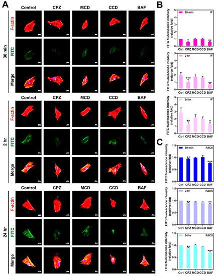 The endocytosis mechanisms of MSC uptake AuNP-Col (2.5 ppm) investigated by various inhibitors. (A) The MSCs were pre-treated with different inhibitors. Next, the AuNP-Col-FITC 2.5 ppm solutions were added and incubated for 30 min, 2 h and 24 h. The images were obtained by fluorescence microscopy. Scale bar: 20 μm. Green fluorescence: AuNP-Col-FITC (2.5 ppm); red fluorescence: F-actin; blue fluorescence: cell nuclear stained by DAPI. (B,C) The uptake amount quantified by FITC fluorescence intensity was analyzed based on IF and FACS methods. The results were quantified in triplicate. * p < 0.05, ** p < 0.01, *** p < 0.001: compared to the control (treatment without inhibitors).