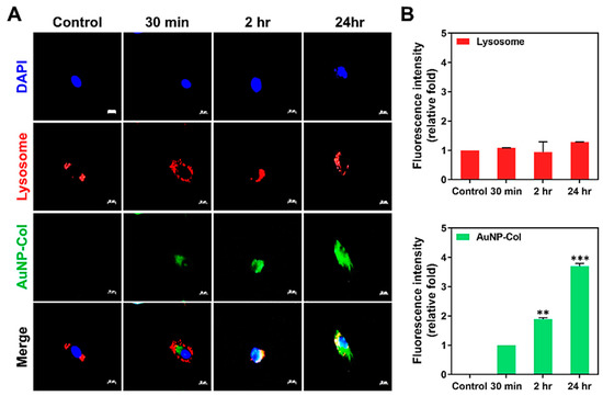 The intracellular transportation of AuNP-Col in Wharton’s jelly MSCs investigated by LysoTracker assay at 30 min, 2 h and 24 h. (A) The fluorescence images were acquired by fluorescence microscopy. Scale bar: 20 μm. Green color: AuNP-Col-FITC (2.5 ppm); red color: lysosome; blue color: cell nuclei were stained by DAPI solution. (B) The fluorescence intensity of lysosome and AuNP-Col-FITC were analyzed and quantified by Image J software. The results were quantified in triplicate. ** p < 0.01, *** p < 0.001: compared to the 30 min group.