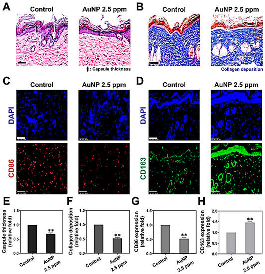 The foreign body response induced by AuNP 2.5 ppm by in vivo animal models. (A) The capsule formation was demonstrated by H&E staining. (B) The collagen deposition was evaluated by Masson’s trichrome staining assay. (C,D) The M1 (CD86, red color) and M2 (CD163, green color) macrophage polarization was investigated by immunohistochemistry staining assay. DAPI was used for cell nuclei staining (blue color). The scale bars were 100 μm. The results were quantified as: (E) capsule thickness, (F) collagen deposition, (G) CD86 expression and (H) CD163 expression. The results were quantified in triplicate. ** p < 0.01: compared to the control (treatment without AuNP 2.5 ppm).