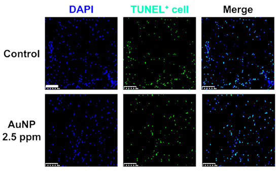 AuNP 2.5 ppm was used in animal models to examine the induction of foreign body responses. Figure 10A shows the images of capsule formation by H&E staining, and Figure 10E shows that the capsule thickness was significantly lower in AuNP 2.5 ppm treatment (~0.68-fold, ** p < 0.01). The collagen deposition was further investigated, as shown in Figure 10B,F, while the deposition seen in the AuNP 2.5 ppm treatment group (~0.52-fold, ** p < 0.01) was remarkably lower than that of the control group. Moreover, the macrophage polarization (M1, CD86, red color; M2, CD163, green color) was evaluated through immunohistochemistry staining assay (Figure 10C,D). The fluorescence intensity was quantified and the results, displayed in Figure 10G,H, indicate a significantly lower CD86 expression (~0.52-fold, ** p < 0.01) but higher CD163 expression (~1.46-fold, ** p < 0.01). Furthermore, we conducted a TUNEL assay to investigate apoptosis cells after treatment with AuNP. The fluorescence images are displayed in Figure 11, and the statistical analysis (data not shown) demonstrated no significant difference compared to the control. It was demonstrated that AuNP 2.5 ppm did not trigger serious foreign body responses, which indicates its potential for clinical applications.