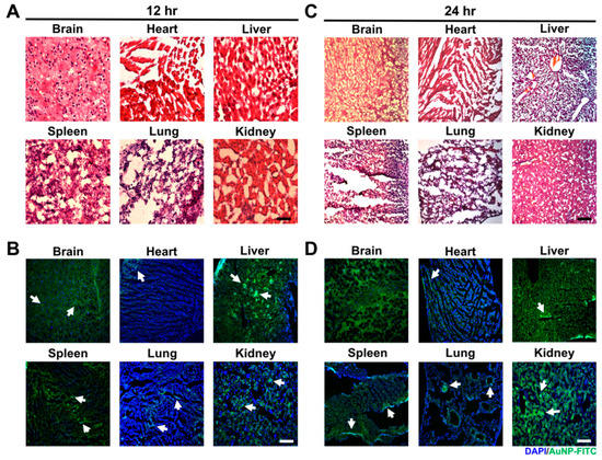 Examination of tissue integrity and particle distribution after AuNP treatments for 12 and 24 h. AuNP solution at a concentration of 2.5 ppm was injected into the retro-orbital sinus of the experimental mice. The brain, heart, liver, spleen, lung and kidney tissues, were subjected to H&E staining assay and fluorescence observation. (A,B) The images of tissue morphology and particle distribution were exhibited after 12 hours’ treatment. (C,D) The images of tissue morphology and particle distribution after 24 h treatment. The results of H&E staining demonstrated AuNP did not cause serious destruction in any of the tissue types, and the nanoparticles (green fluorescence) could be observed in these tissues. This indicates that AuNP may have potential for nanodrug applications. DAPI was used to observe the cell nuclei. Scale bar: 50 μm. Arrow: FITC-positive cells.