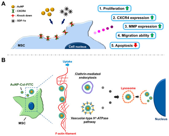 (A) The illustration indicates that AuNP at concentrations of 1.25 and 2.5 ppm could strengthen the Wharton’s jelly MSC biological performance via the SDF-1α/CXCR4 pathway. (B) A schematic diagram of the endocytic pathways of AuNP-Col uptake by Wharton’s jelly MSCs.