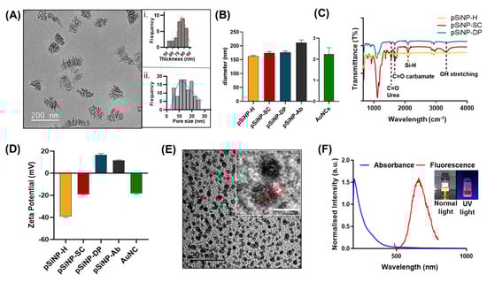 pSiNPs were obtained by electrochemical anodisation followed by sonication, as previously described [48]. The nanoparticles were size-excluded via a series of centrifugation processes to obtain plate-shaped (discoidal) nanoparticles of lateral dimensions of 121 ± 10 nm, as confirmed by transmission electron microscopy (TEM) (Figure 1A). The nanoparticle thickness was determined to be 74 ± 9 nm (calculated as the mean thickness of 30 pSiNPs) and the pore size was 14 ± 5 nm (calculated as the mean of 100 randomly selected pores). The histograms were mounted using the Sturges method [49]. The bin-width (W) is obtained from the relationship: W = (Dmax − Dmin)/k, where k = 1 + 3.322 log (N), and N is the number of values. The histogram was further modelled using a log-normal distribution, as shown in Figure 1A(i,ii). The dynamic light scattering (DLS) showed an average particle size of 158 ± 4 nm for freshly etched pSiNPs (pSiNP–H) (Figure 1B). As pSiNPs obtained are discoidal in shape [50], DLS size will vary from the actual size as DLS might not take the contribution of rotational diffusion into account for nonspherical particles [51].
