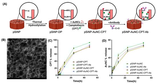 pSiNPs have been established as efficient carriers for therapeutics due to their high drug-loading capacity and controllable drug release through surface functionalisation [54]. Camptothecin (CPT) is a poorly soluble drug that targets and destabilises DNA topoisomerase I in the cell nuclei, inhibiting DNA relegation and thereby causing apoptosis [55]. We have previously demonstrated pSiNPs as effective vectors for CPT delivery with a drug-loading efficiency of 11–15 wt% [15,52]. To further enhance their capacity to load both CPT and AuNCs, we increased the total surface area by fabricating pSiNPs with smaller pore sizes (12 nm) compared to Secret et al. (24 nm) [52].