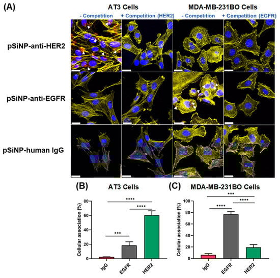 The cellular association of pSiNP–anti-HER2 and pSiNP–anti-EGFR was evaluated against the two breast cancer cell lines using confocal microscopy and flow cytometry to demonstrate the cell specificity of our nanoparticles (Figure 3). The antibodies (anti-HER2 and anti-EGFR) were tagged with Cy5 prior to the attachment to pSiNPs to allow fluorescence detection. Confocal microscopy images (Figure 3A) qualitatively confirmed the binding of Cy5-labeled pSiNP–anti-HER2 to AT3 cells, which are HER2-positive. In contrast, no binding of pSiNP–anti-HER2 was observed when AT3 cells were preincubated with free anti-HER2 antibodies, attributable to the active competition for HER2 receptors on the cell surface. The same pattern of results was observed when MDA-MB-231-BO cells (EGFR-positive) were incubated with Cy5-labeled pSiNP–anti-EGFR in the presence or absence of a free anti-EGFR antibody (Figure 3A). As controls, pSiNP–anti-HER2 and pSiNP–anti-EGFR were incubated with the opposite cell line where cell surface receptors were not overexpressed (e.g., MDA-MB-231-BO incubated with pSiNP–anti-HER2 as a negative control). Confocal microscopy images showed that when cross-incubated with opposing cell lines, no visible Cy5-labeled pSiNPs could be detected. Similarly, cells incubated with pSiNPs functionalised with a nontargeting IgG human monoclonal antibody showed no visible fluorescence. Taken together, this suggests that cellular association was receptor-mediated as no visible particle association was observed when (i) in competition with free antibody, (ii) incubated with cells that do not overexpress the corresponding receptor, and (iii) when the antibody on the surface of the pSiNP is nonspecific. To further corroborate this, we quantified the cellular association via flow cytometry (Figure 3 and Figure S5). After incubating pSiNPs with AT3 cells for 1 h, 1.9 ± 0.2%, 15.1 ± 3%, and 57.2 ± 6% of cells had associated with pSiNP–human IgG, pSiNP–anti-EGFR, and pSiNP–anti-HER2, respectively (Figure 3B). When incubating pSiNP with MDA-MB-231-BO cells for 1 h, 1.3 ± 1%, 72 ± 3%, and 15.2 ± 3% of cells had associated with pSiNP–human IgG, pSiNP–anti-EGFR, and pSiNP–anti-HER2, respectively (Figure 3C). The obtained results demonstrate that the antibody-displaying pSiNPs can selectively target specific cells based on the receptors present on the cell surface. Previous literature suggests that pSiNPs are readily endocytosed after being actively recognised by cell surface receptors [66].