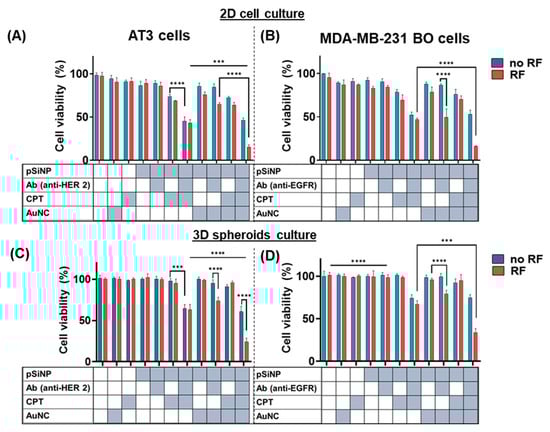 The following supporting information can be downloaded at: https://www.mdpi.com/article/10.3390/pharmaceutics15051389/s1, Figure S1: Schematic showing the experimental setup for cell viability assay: (A) for monolayer cells and (B) for 3D spheroids. X in pSiNP–X refers to different loads and functionalities used for the experiments. Figure S2: (A) Customised setup to generate RF radiation in the microwave field (1 GHz). (B) Schematic showing parameters for the coil used for RF generation. Table S1: Design parameters for the RF coil. Figure S3: (A) Simulation of the RF coil in (i) the X–Y plane, (ii) the Y–Z plane, (iii) the X–Y plane, and (iv) the distribution of the magnetic field flux lines of the RF coil. (B) Estimation of the generated magnetic field flux by mathematical (red) and simulation (black) methods using MATLAB and COMSOL Multiphysics, respectively. (C) Measurement of the return loss of the coil using a vector network analyser (VNA). Figure S4: Heating of AuNCs in PBS compared to only PBS when placed inside RF coil for different time points (n = 3). The temperature was measured using an IR camera. Figure S5: Gating used for flow cytometry analysis of HER 2 and EGFR expression in AT3 and MDA-MB-231 BO cells. Figure S6: (A) Cell viability of AT3 cells upon exposure to RF for the time indicated on the X-axis after treatment with AuNCs alone and 100 µg/mL pSiNP–Ab with different loads, and corresponding temperature in the well after the indicated RF exposure time. (B) Cell viability of AT3 spheroids with different concentrations of pSiNPs with different loads to optimise pSiNP concentration and time of incubation (No pSiNP were added to the control group and for just CPT group, the CPT concentration equivalent to the amount loaded in respective pSiNP concentration was added to the cells). Figure S7: (A) Schematic for the experimental flow for determination of ROS generation in AT3 cells by pSiNP–CPT–Ab; (B) ROS generation in AT3 cells after 1 h incubation with 100 µg/mL pSiNP–CPT–Ab; Fluorescence signals for ROS were recorded after 0 h, 4 h, 10 h, and 24 h; (C) schematic for the experimental flow for the determination of ROS generation in AT3 cells by pSiNP–AuNC–Ab nanoparticles; (D) ROS generation in cells treated with 100 µg/mL pSiNP–AuNC–Ab after 15 min RF exposure (fluorescence recorded at 0.5 h, 2 h, and 4h after cells were treated with RF).