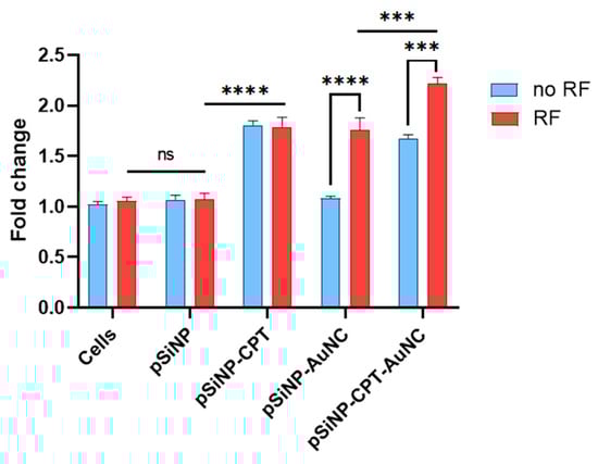 ROS generation. ROS generation in AT3 cells after incubation with 100 µg/mL pSiNPs (pSiNP–Ab, pSiNP–CPT–Ab, pSiNP–AuNC–Ab, pSiNP–AuNC–CPT–Ab) with and without the application of RF. Here, ‘Ab’ refers to the anti-HER2 antibody. (n = 3, *** p ≤ 0.001, and **** p ≤ 0.0001, ns = not significant).