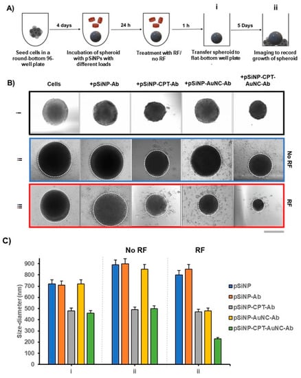 BCa cells have an accelerated cell division process, invading surrounding tissues and leading to metastasis and the formation of new tumours in other areas of the body. It is essential to ensure the inhibition of cell proliferation to achieve high therapeutic efficiency. We assessed the effect on cell growth in AT3 3D spheroids after treatment with pSiNPs loaded with variable payloads with and without exposure to RF. Figure 7A shows the experimental process to observe changes in the growth rate of spheroids after treatment. The round-bottom well plate format offers low cell attachment, confining the physical space, and promoting the formation of spheroids. Once these spheroids were transferred to flat-bottom plates, the cells attach to the plate surface and continue to proliferate as a spheroid. To understand the impact of the combination treatment on the growth and proliferation of these 3D cell aggregates, we transferred AT3 spheroids once they grew to about 500 µm (diameter) to flat-bottom plates after treating them with pSiNPs with different payloads, with or without RF radiation (Figure 7B). When no treatment was given, the spheroids continued to grow in diameter and showed cell proliferation on the well plate surface. We further observed that spheroids treated with pSiNP–CPT–Ab and pSiNP–CPT–AuNC–Ab without RF exposure were smaller in size compared to spheroids not treated with CPT (24 h post-treatment). This suggests that the proliferative capacity of AT3 cells was reduced after exposure to CPT. However, some viable cells continue to attach to the well plate. Similarly, spheroids treated with pSiNP–AuNC–Ab and exposed to RF showed reduced proliferation and attachment to the surface of the plate for up to 5 days. In contrast, spheroids treated in combination (pSiNP–CPT–AuNC–Ab with RF) showed no proliferation and growth, and shrank in size drastically within 5 days, showing no signs of viability. The images also correlate with the in vitro cell viability assay for spheroids (Figure 5C), wherein the combination treatment showed the highest efficacy in killing cancer cells compared to treatment with pSiNP–CPT–Ab and pSiNP–AuNC–Ab after RF exposure.