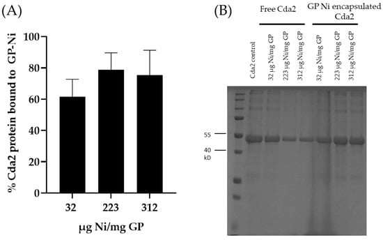 Figure 3). The results of the GP-Ni samples prepared at medium (223 µg Ni/mg GP) and high (317 µg Ni/mg GP) ratios show that ~80% of the Cda2 protein was efficiently trapped in GP-Ni.
