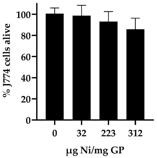 22]. We examined the cytotoxicity of the GP-Ni formulations by adding GP-Ni to macrophage cells at a ratio of 33:1 GP-Ni: cell. The samples were incubated for 24 h, and the cell viability was assessed using the Alamar blue viability assay. The results (