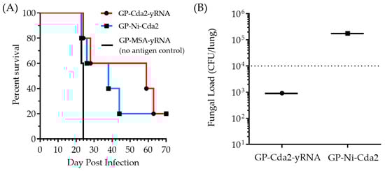 33]. The fungal load measured from the lung homogenates of the euthanized mice showed a two-log higher CFU in the samples from the animals treated with GP-Ni-Cda2 than the animals treated with the control GP-Cda2-yRNA (