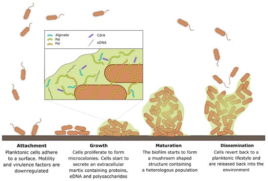 Biofilm development including cycles of growth, attachment, maturation, and dispersal [15]. The bacteria will first attach to the implant surface and suppress mortality factors but induce adhesion factors. The growth period is when the bacteria will start dividing and recruit other bacteria to create a colony. The maturation is when the biofilm grows a matrix to protect the bacteria inside, and finally dispersal will lead to detachment of some bacteria to spread elsewhere. The matrix includes exopolysaccharides as shown in the legend including alginate, Pel and PsI,. CdrA (a protein) and extracellular DNA (eDNA) add structural strength to the matrix. Reproduced with permission from Maunders, FEMS Microbiol Lett, published by (Oxford University Press), (2017).