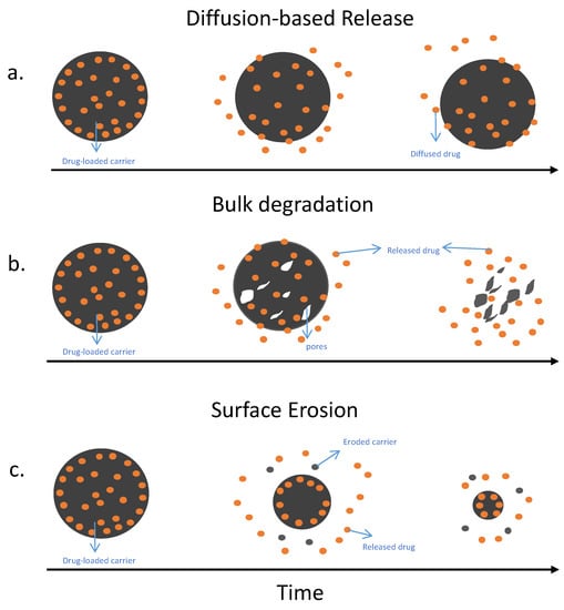 Research is focused on developing drug delivery carriers that can load antibiotics and deliver them over an extended period of time. The purpose of those carriers is to deliver the drugs, biodegrade, and maintain release for a long period. Carriers that have antibacterial properties themselves can help to eliminate biofilms more effectively by working synergistically with the antibiotics to treat the infection. Figure 2 shows drug release kinetics that are involved in delivering antibiotics locally to fight infection. Drug release depends on several factors that include surface area, drug diffusion rate [35], carrier mode, and rate of degradation, as well as swelling and creation of the pores [36]. Some carriers can release drugs based mainly on a combination of factors, as represented in Figure 2. First, the (A) shows diffusion-based drug delivery diagram shows the drug is released in a short period of time as the material diffuses out of the material before it degrades. This method usually occurs when hydrophobic or small hydrophilic or hydrophobic antibiotics are added. These antibiotics will be released quickly in a short period of time. The second diagram (B) represents bulk erosion, which means that the degradation will occur relatively fast as pores are created, and there will be a late onset of large burst release. The third diagram (C) represents a surface eroding carrier that releases antibiotics as it degrades layer by layer [36], slowly and steadily releasing the antibiotics over the desired period.