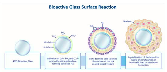 Bioactive glass is considered biocompatible because it is not rejected by the body when implanted. Biocompatibility is defined as “the ability of a material to perform with appropriate host response” [72]. Bioactive glass can integrate with the bone in the body and stimulate bone growth, which makes it biocompatible and bioactive [72]. According to Hench (2014), the biocompatibility of bioglass has been demonstrated though in vitro and in vivo studies which have been approved by the FDA [73]. When bioactive glass is exposed to physiological fluids, it develops a bone-like apatite layer that is similar to the mineral phase of bone, usually starting within the first 12–24 h after its inserted into the body [74], as shown in Figure 3. When bioglass is placed inside the body, it interacts with biological fluids, leading to the exchange of network modifier ions (Na+ or Ca+2) from bioglass with ions from the body fluids such as H+ or H3O+ [75,76]. The exchange of these ions will lead to changes in the pH level in the microenvironment to go from 7 to 10. This change in pH results in alkaline surroundings, as well as enhancing the osmotic pressure because of the change in the salt concentration. This chain of actions improves the antibacterial properties inhibiting the growth on implants. The increase in local proton concentration leads to the formation of silanol (Si-OH) groups resulting from the hydrolysis of the silica. The condensation and re-polymerization of the Si-OH groups at the surface of the granules lead to the development of a silica–gel layer [48]. This silica–gel layer will thicken as a result of the exchange of alkali ions, and it will have a negative charge that will attract the calcium and phosphate from the body fluids, creating a layer of rich amorphous calcium phosphate on top of the silica gel. The calcium phosphate phase binds to surrounding hydroxide and carbonate anions, leading to its crystallization [48,73]. Then it gradually transforms into a carbonated hydroxyapatite (HCA) layer, which resembles natural bone. Moreover, the bioactive glass plays an important role in regeneration of bone by recruiting osteoprogenitors, which will differentiate into osteoblasts driven by osteo-stimulating properties of the bioglass, this will lead to an increase in local bone healing and remodeling [52]. The osteostimulatory properties of the bioglass refer to its capacity to recruit and stimulate osteoblasts to form bone, while its osteo-inductive properties refer to its capacity to recruit stem cells and differentiate them into osteoblasts [74,75,76].