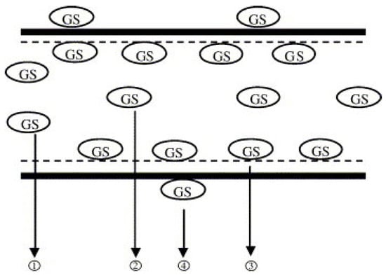 The states of gentamicin (GS) molecules hosted within MBG, including (1) GS inside the pores of the window, (2) GS entrapped in mesopores and no hydrogen bonds, (3) GS in mesopores with hydrogen bonds with Si-O and P-O, and (4) GS molecules adsorbed on external surface [92]. Reproduced with permission from Xia, Journal of Controlled Release, published by Elsevier, 2006.