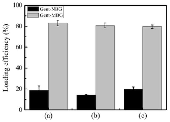 MBG drug loading efficiency compared to non-mesoporous BG in gentamicin solution with different initial concentrations [93]. The loading efficiency for the MBG is around 80%, while it is much lower for the NBG. (a–c) Different concentrations of gentamicin solutions used in the study: (a) 400 μg/mL, (b) 600 μg/mL, and (c) 800 μg/mL. Reproduced with permission from Li Journal of Materials Science: Materials in Medicine, published by Springer Nature, 2013.