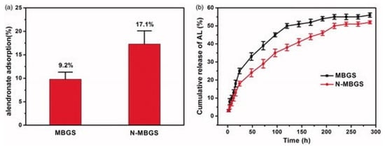 Wang et al. (2018) examined the capacity of amino-modified mesoporous bioactive glass (N-MBG) to deliver Alendronate (AL), which is a commonly used drug for osteoporosis [94]. This drug has low bioavailability and low efficiency when delivered orally so their study was aiming to find a drug delivery system that can locally deliver the drug. In their study the researchers used an MBG scaffold but modified it post-production with an amino group that is hypothesized to give it better bone-bonding capacity and decrease the degradation rate [94]. To make the scaffold, they used polyvinylpyrrolidone (PVP), polyethylene glycol (PEG), and MBG powder. The three materials were mixed and added to a mold to shape the scaffold and pressed under 5 MPa to form the final scaffold; this was followed by adding the amino functional group by adding aminopropyltrimethoxysilane. The drug was loaded into the scaffold by immersion in a solution containing the drug. The group compared the loading capacity and release rate of both the scaffold and the amino functionalized scaffold and found that the amino-functionalized group had better loading capacity and better performance overall, as shown in Figure 9.
