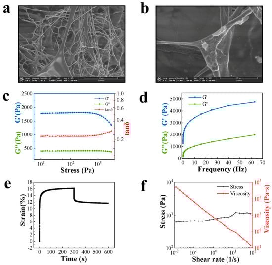 (a) ESEM observation of the cataplasm (800×). (b) ESEM observation of the cataplasm (1300×). (c) Variation in viscoelastic parameters with stress. (d) Variation in viscoelastic parameters with frequency. (e) Variation in strain in the creep-recovery test. (f) Variation in stress and viscosity with shear rate.