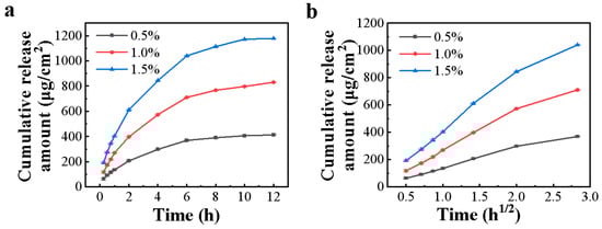 In vitro release rate of ketorolac tromethamine in different doses of cataplasm; (a) the variable in the horizontal coordinate is time (h); (b) the variable in the horizontal coordinate is time (h1/2); all values are expressed as mean ± SD, n = 6.
