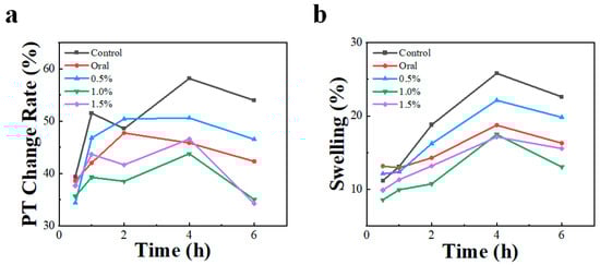 Figure 5a illustrates how the rise in the PT change rate was restrained in the other groups as compared to the control group. In other words, each treatment showed different degrees of analgesic effect. Rats in the oral, mid-dose (1.0%), and high-dose (1.5%) groups exhibited lower rates of change in their PTs, with no significant differences between each group. This result suggests that our cataplasm can provide analgesic effects comparable to those of oral administration.