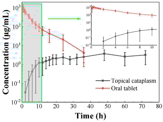As shown in Figure 6 and Table 7, the Cmax of the cataplasm group was 4.10 ± 2.15 ng/mL, which was much lower than that of the tablet group (1231.84 ± 380.25 ng/mL). The blood concentration of topically administered ketorolac tromethamine cataplasm was more stable in humans relative to oral tablets, indicating that the rate of ketorolac tromethamine in the cataplasm was essentially constant through the skin, exhibiting a slow absorption behavior. The AUC0-t and AUC0-∞ were 166.31 ± 85.28 h·ng/mL and 355.17 ± 144.96 h·ng/mL, respectively, for cataplasm and 4450.48 ± 1383.62 h·ng/mL and 4489.58 ± 1414.70 h·ng/mL, respectively, for tablets, and the plasma exposure of the drug was much lower for cataplasm than for tablets. The systemic exposure of ketorolac tromethamine mostly caused side effects such as gastrointestinal injury and liver damage; therefore, the safety risk of administration in the form of topical application of cataplasm is lower compared to tablets.