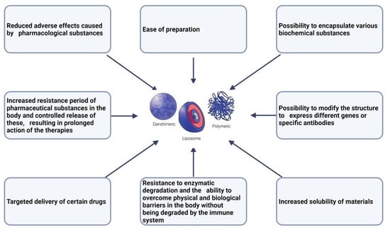 The use of nano systems in medicine has numerous advantages, which are presented in Figure 1. In the case of oncological pathologies, the main advantage of using nanoparticles is that they can be directed to the sites of tumors by conjugating them with different monoclonal antibodies or peptide ligands that exhibit specificity for the receptors of the cells that these systems are intended to reach [27,28].