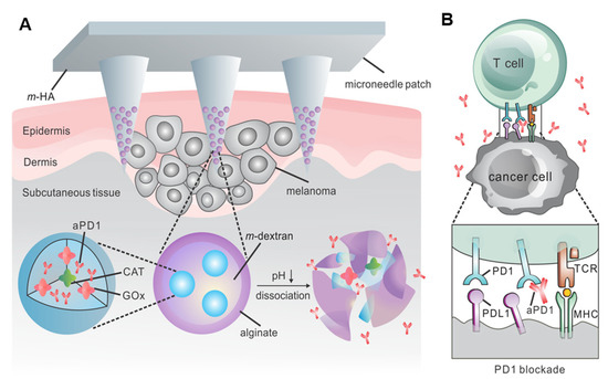 In another study, a self-degradable biocompatible hyaluronic acid microneedle was loaded with pH-sensitive glucose nanoparticles that encapsulate antiprogrammed death 1 (aPD1) antibody and glucose oxidase (GOx), which converts blood glucose to gluconic acid (Figure 2A) [55,56]. The generation of an acidic environment facilitated the self-dissociation of nanoparticles, which subsequently resulted in a massive release of aPD1. Skin is a perfect tissue for triggering an associated immune response [57,58,59]. aPD1 acts as an immune checkpoint inhibitor to prevent T-cell apoptosis by blocking the PD-1 receptor on the surface of T cells [60]. This enables T cells to effectively fight tumor cells. In this work, pH-responsive dextran nanoparticles were prepared by a double-emulsion (oil-in-water) solvent evaporation/extraction method. Compared with systems without triggered release or intratumoral injection, pH-responsive microneedles had a more pronounced therapeutic effect in eradicating a mouse model of melanoma [61,62,63,64,65]. Overall, the microneedle delivery system has great potential and biomedical promise in the treatment of skin cancer.