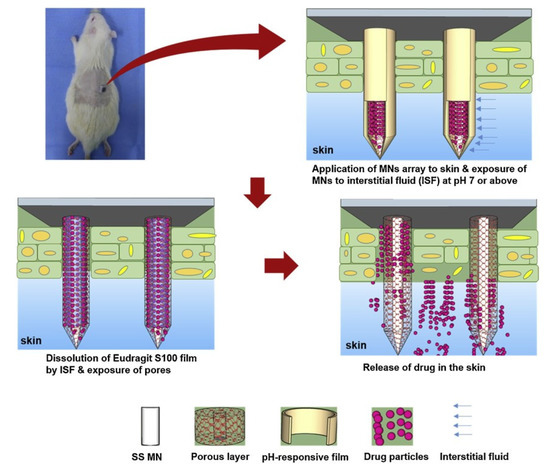 After the microneedles are exposed to the medium at alkaline pH (vulnus pH), the drug encapsulation film is dissolved, and the pores on the microneedle are exposed, which releases the encapsulated payload in the vulnus pH microenvironment. Reprinted with permission from [67]. Copyright 2021, Elsevier.