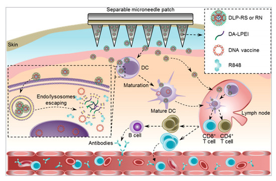 Schematic illustration of the separable microneedle patch mediated intracutaneous delivery of DNA nanovaccines for fighting the SARS-CoV-2 virus. Deoxycholic acid-conjugated low-molecular weight polyethylenimines (DA-LPEI) was applied to encapsulate both R848 and S-or N-protein-encoding DNA vaccines (DLP-RS or RN). The microneedle patch can painlessly penetrate the epidermis into the dermis layer, where it releases the DLP-RS or DLP-RN nanoparticles. Reprinted with permission from [99]. Copyright 2021, American Chemical Society.
