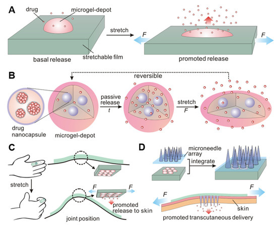 Diagram of the mechanical force response delivery system. (A,B) The elastomeric substrate deforms under stretching, releasing the drug from the microreservoir. (C) The drug-loaded patch is attached to the finger joint, and the drug release is triggered by bending the finger. (D) The drug-loaded patch is combined with the microneedle array patch, and the drug released from the drug-loaded library is transdermally administered through the microneedles. Reprinted with permission from [35]. Copyright 2015, American Chemical Society.