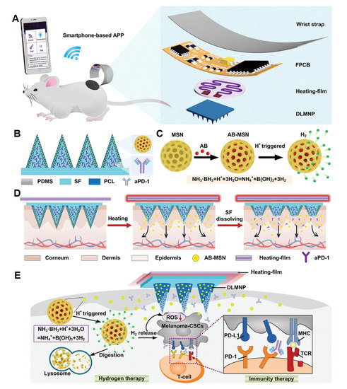 The schematic diagram of SMND preparation and the intelligent drug delivery scheme. (A) The SMND patch is mainly composed of a microneedle patch layer, a heating layer, and a flexible circuit layer (FPCB), which is controlled by a smartphone application (APP). (B) The structure and composition of the microneedle patch layer. The SF loaded with aPD-1 is inside the microneedle, and the PCA-coated AB-MSN is a thermally responsive outer coating. (C) The acid-triggered decomposition and release H2 diagram of AB-MSN. (D) The drug release diagram of SMND under APP control. (E) The mechanism of SMND synergistic immune/hydrogen therapy for CSCs. Reprinted with permission from [167]. Copyright 2022, John Wiley and Sons.