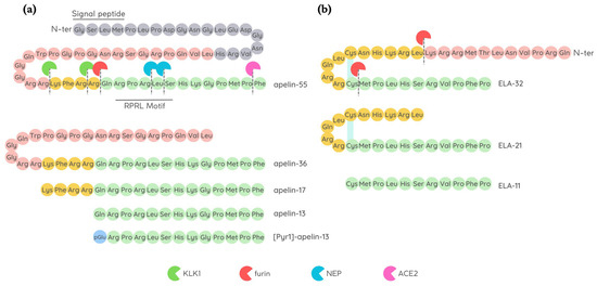 Amino acid sequence of apelin and ELABELA (ELA) peptides. (a) Schematic representation of apelin-13, apelin-17, apelin-36, and [Pyr1]-apelin-13 that may all be produced by further processing of apelin-55; all the isoforms have the ability to bind APJ. Angiotensin-converting enzyme type II (ACE2), furin (also known as PCSK3), kallikrein (KLK1), and neprilysin (NEP) degrade native apelin isoforms, thus affecting their bioavailability; (b) Schematic representation of ELA peptide maturation by furin convertase to generate ELA-21 and ELA-11 fragments. Disulfide bridges are shown as light blue lines.