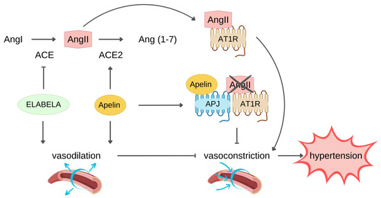 ELABELA and apelin protect against hypertension counteracting the renin-angiotensin II system (RAS) with different mechanisms. Angiotensin Converting Enzyme (ACE) converts Angiotensin I (AngI) to Angiotensin II (AngII), which binds Angiotensin II Receptor Type 1 (AT1R) and induces vasoconstriction, leading to hypertension. Endogenous ELABELA and apelin neutralize AngII-induced vasoconstriction through their direct vasodilator effect. Both ligands exert vasodilation through AngII level reduction: ELABELA downregulates ACE expression, limiting AngII production, while apelin boosts the expression of ACE2 which hydrolyzes AngII to Ang(1–7). The binding of apelin to its receptor APJ leads to the heterodimerization of APJ and AT1R, decreasing the AT1R availability for binding AngII, thus inhibiting the AngII-AT1R signalling pathway that leads to hypertension.