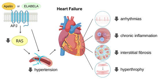 Dual mechanism of ligand-activated APJ in reducing hypertension-induced heart failure. The figure illustrates the two ways in which APJ activation can reduce cardiac overload-induced heart failure. Firstly, by reducing renin-angiotensin system (RAS) activation, APJ lowers blood pressure, thus decreasing cardiac afterload. Secondly, activated APJ directly acts on the heart, decreasing the risk of developing arrhythmias chronic inflammation, interstitial fibrosis, and cardiac hypertrophy, leading to improved cardiac function.